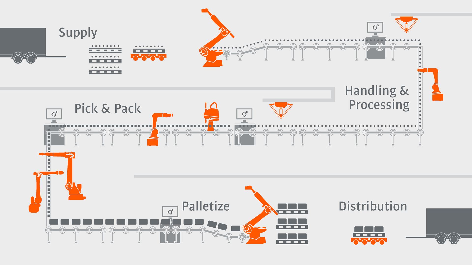 Procesní ?etězec v potraviná?ském pr?myslu obvykle za?íná dodávkou surovin. To je p?esně to, kde p?ichází do hry KUKA – a realizuje to spole?ně se spole?ností Swisslog, spole?nost skupiny KUKA Group, a dal?ími partnery ?e?ení automatizace pro logistické procesy, sklady a distribu?ní centra. Navíc KUKA doká?e inteligentně automatizovat témě??ka?dy dal?í krok p?i zpracování potravin. Vyhody: vy??í produktivita, ni??í náklady a trvale vysoká kvalita Va?ich proces?.
