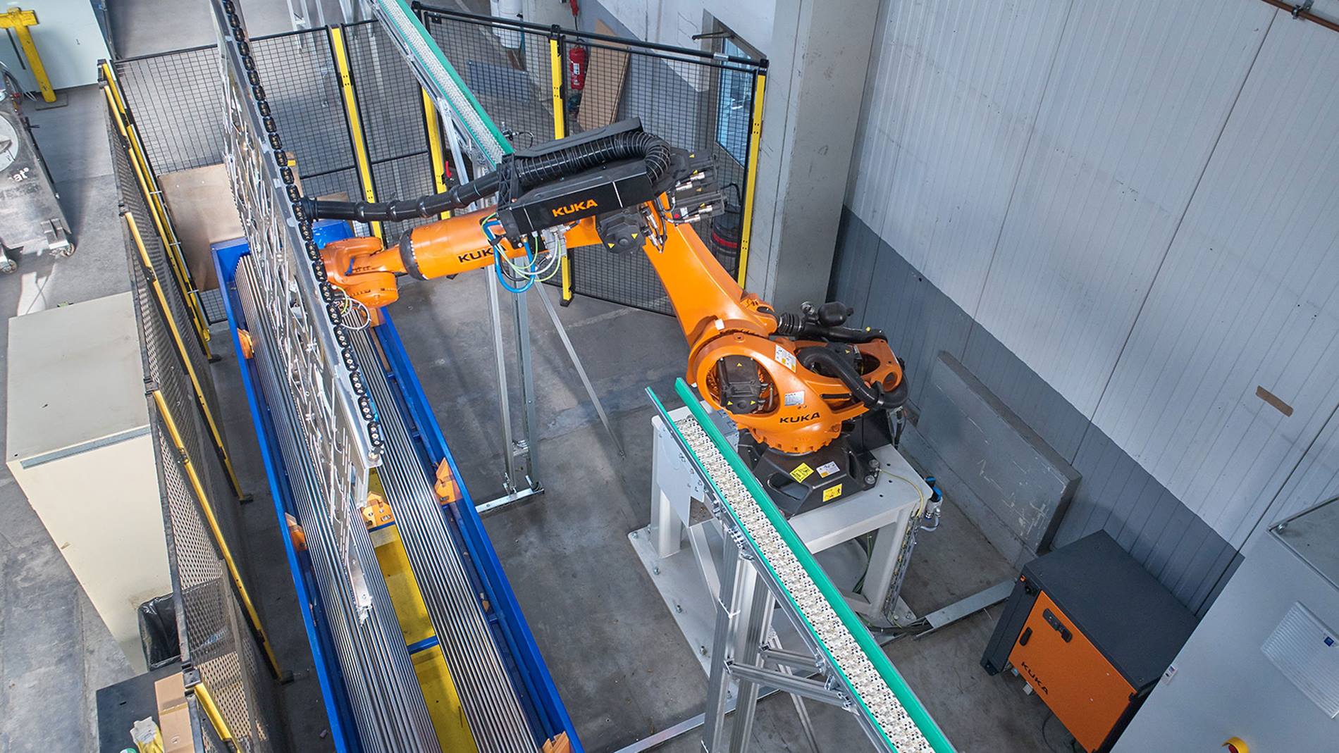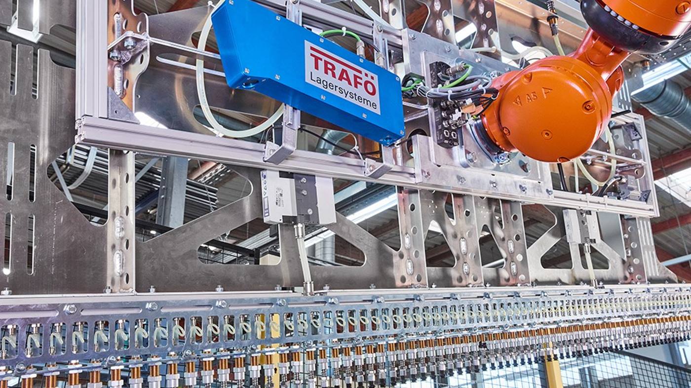 “這種拾取和放置機器人的特別之處在于它為激光器裝載單個管材。”Traf? 的德語區銷售主管 Ulrich Neckermann 說道。“不再需要手動裝料了。”Traf? 為設備開發了專用軟件。該軟件允許所有參與的組件相互通信。數字生產計劃規定應為激光器全自動裝載哪些管材類型。材料通過平板電腦從長條形貨物倉庫訂購。倉儲系統通過輸送設備將訂購的管材供應到機器人單元上的系統料盒中,該輸送設備從倉庫通向機器人,再從那里通向激光器。在上方敞開的料盒中通常存有不同的管材類型。為了確保物體識別,機器人配備了一個 3D 識別系統。